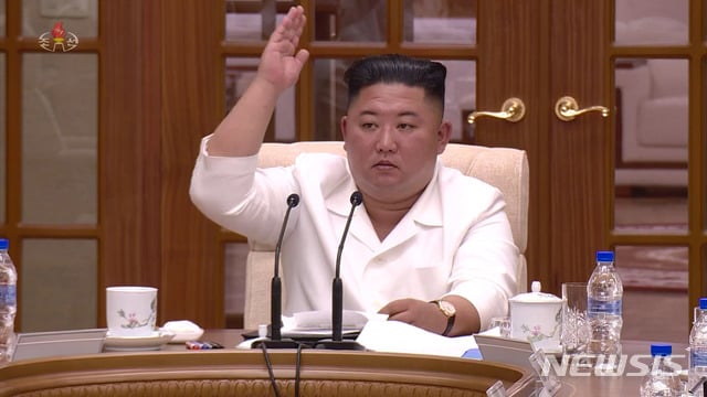 | [서울=뉴시스] 김정은 북한 국무위원장이 지난 25일 정치국 확대 회의를 주재하며 코로나19로 인한 보건위기상황에 대비한 국가 비상 방역태세를 점검하고 제8호 태풍 ‘바비’ 피해 방지를 위한 대책 등을 지시했다고 26일 조선중앙TV가 보도하고 있다. (사진=조선중앙TV 캡쳐) 2020.08.26. photo@newsis.com |